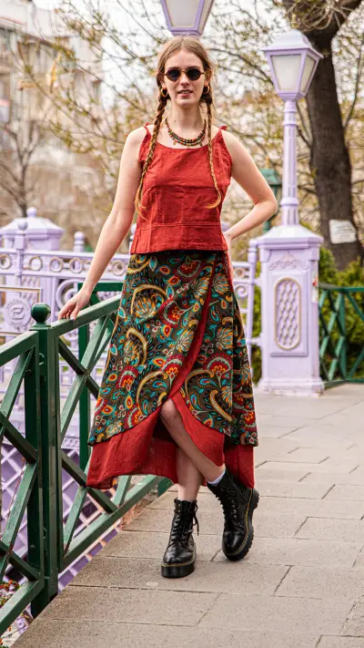 Desenli, Bağlamalı, Midi Boy Etek. Mankenin üzerindeki S bedendir.