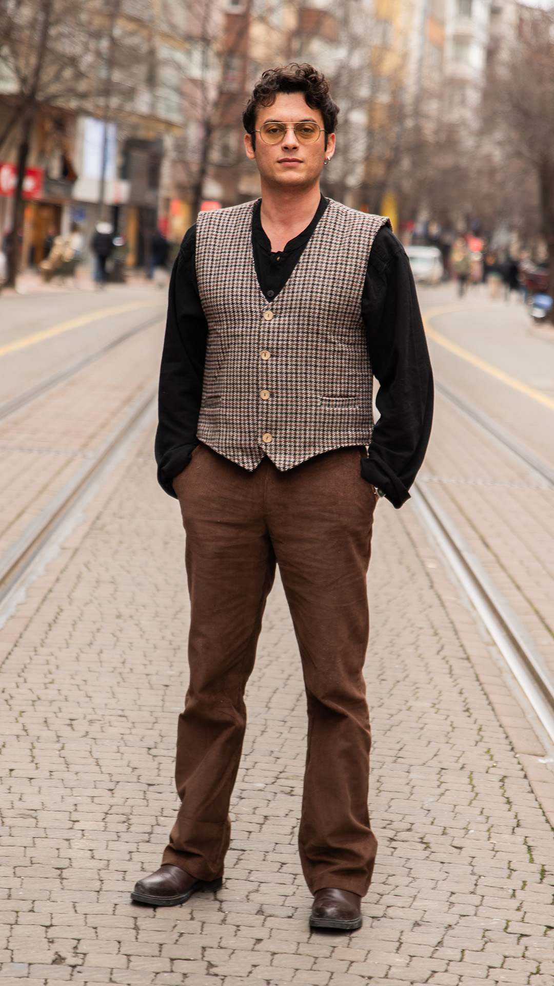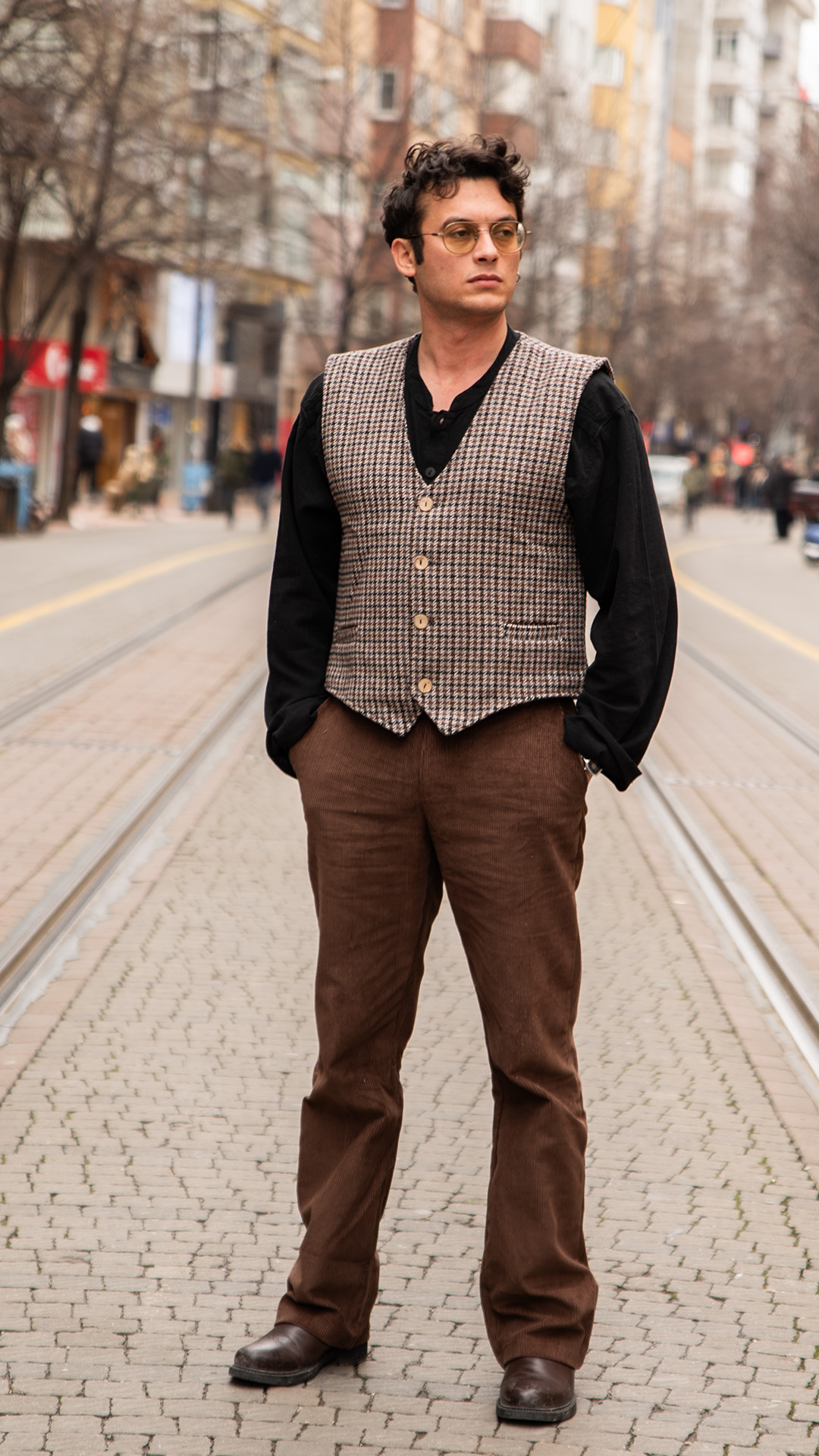 Klasik Kesim, Kazayağı Desenli, Cepli, Pamuk Astarlı Yelek. Mankenin üzerindeki XL bedendir.