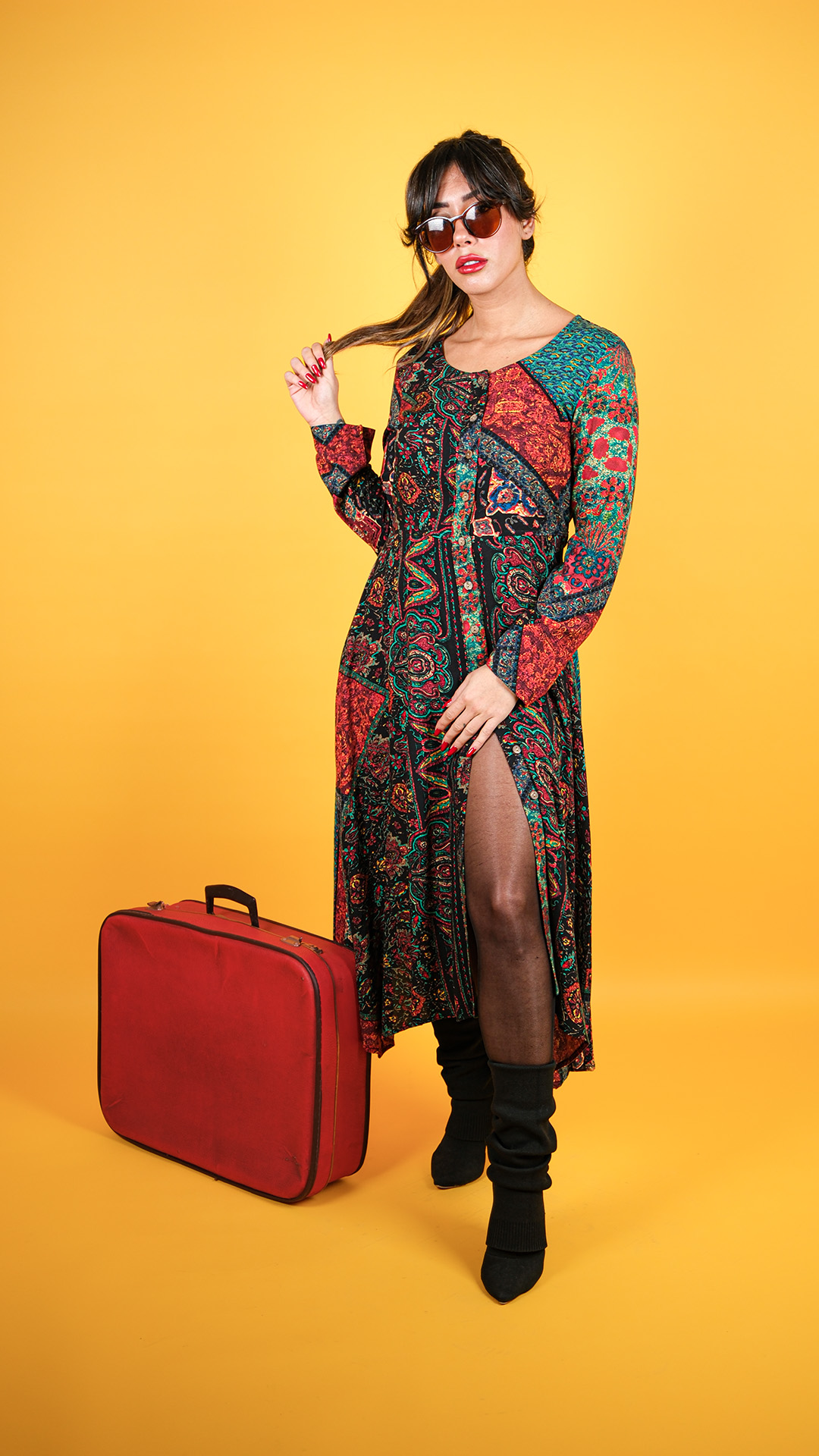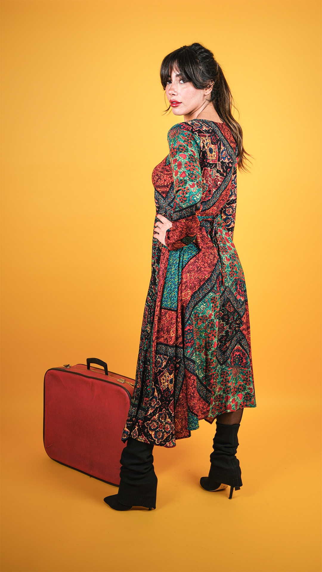 Yuvarlak Yaka, Babil Desenli, Asimetrik Kesim, Kışlık Elbise. Mankenin üzerindeki S bedendir.