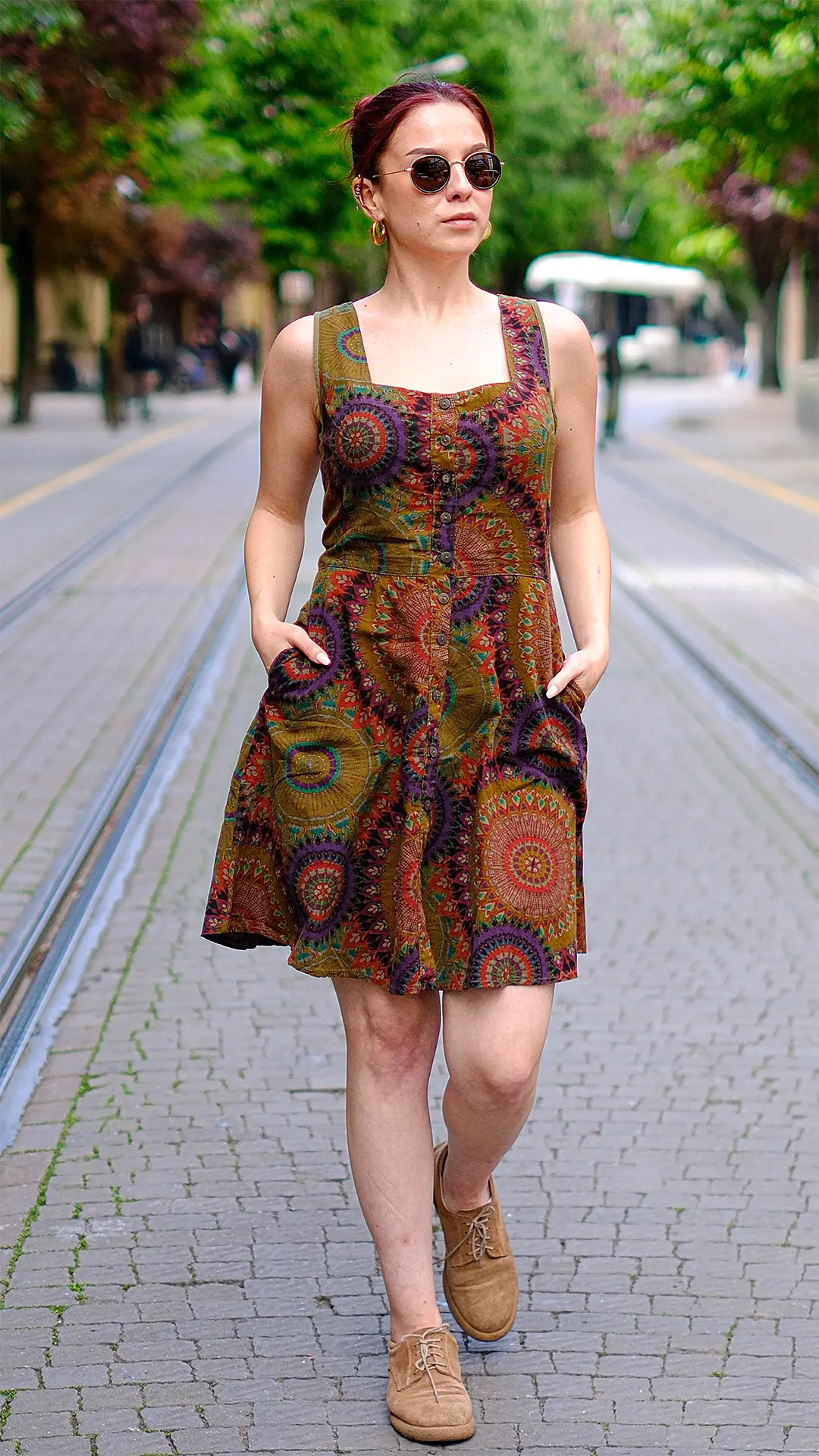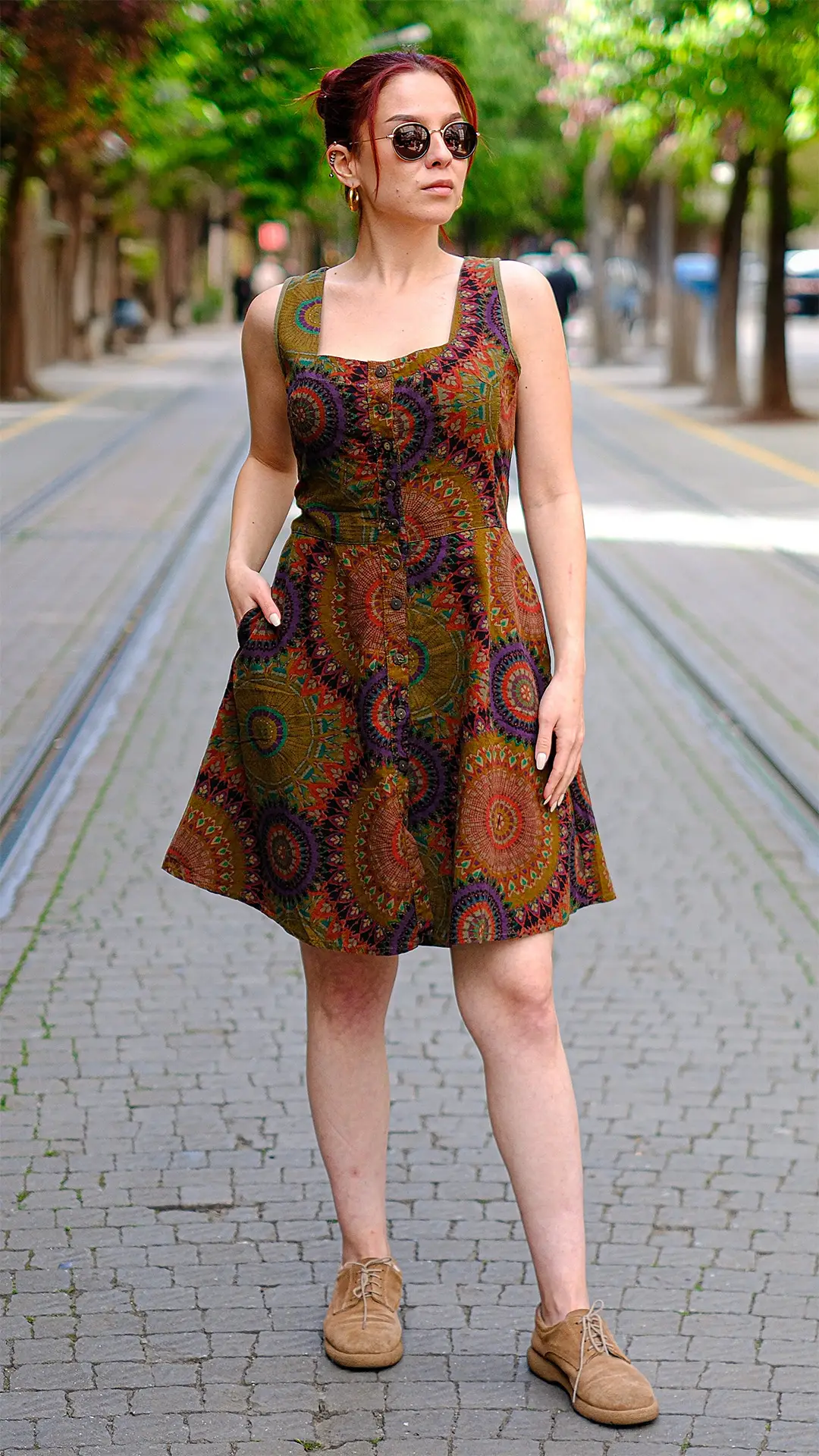 Önü Düğmeli, Geometrik Desenli, Kısa Elbise. Mankenin üzerindeki S Bedendir.