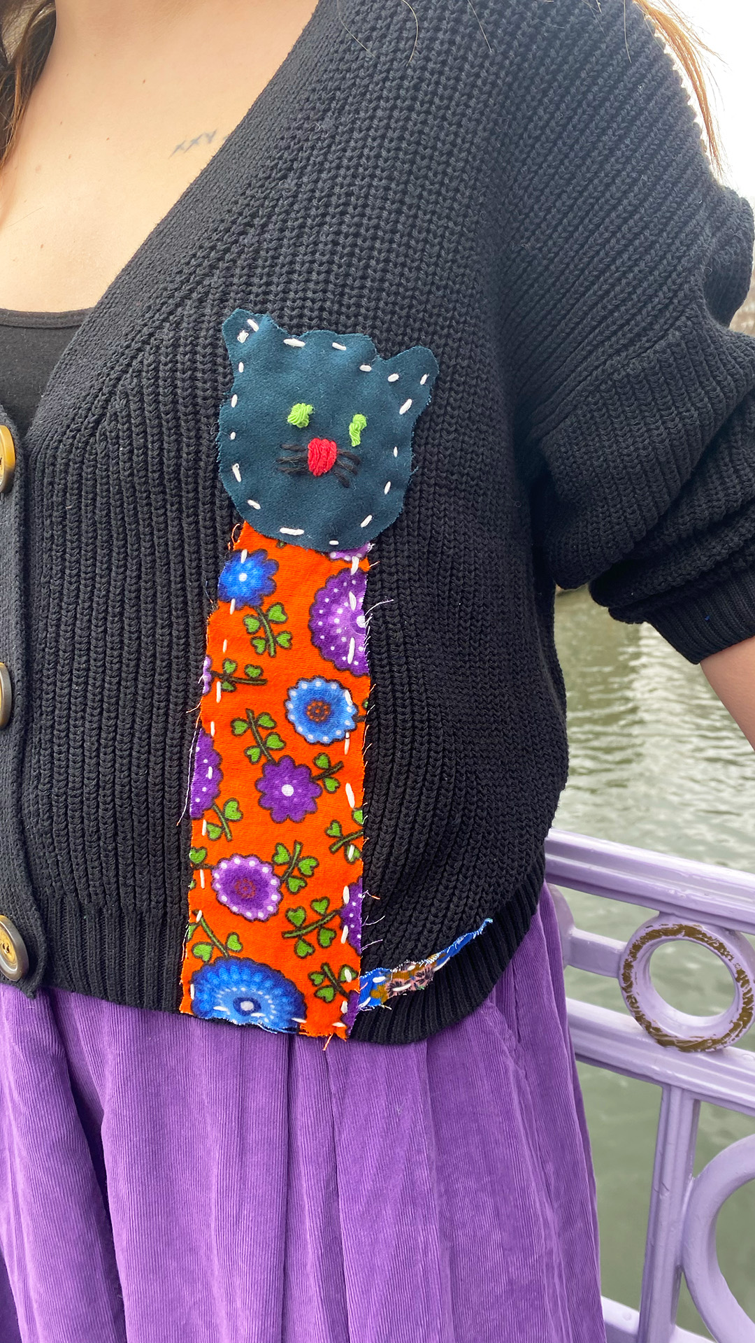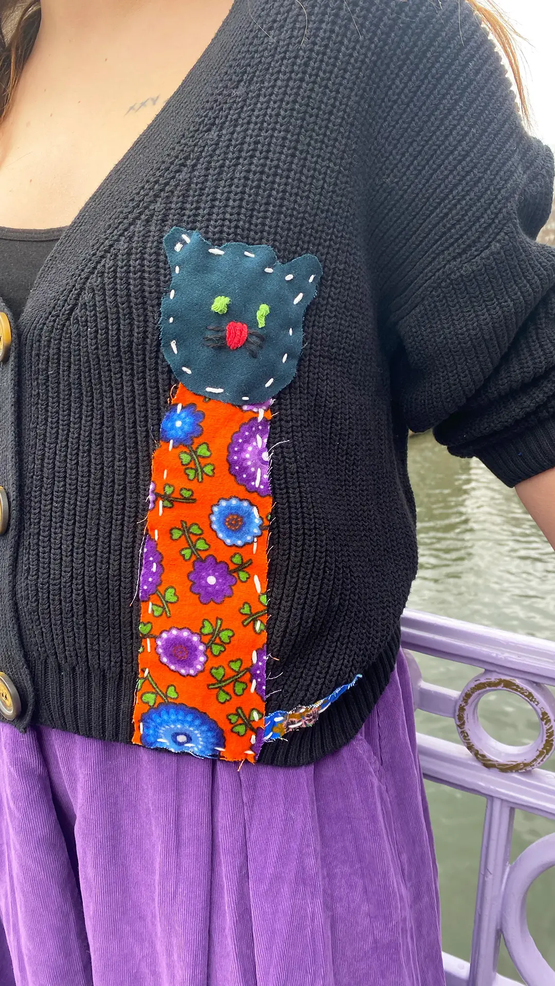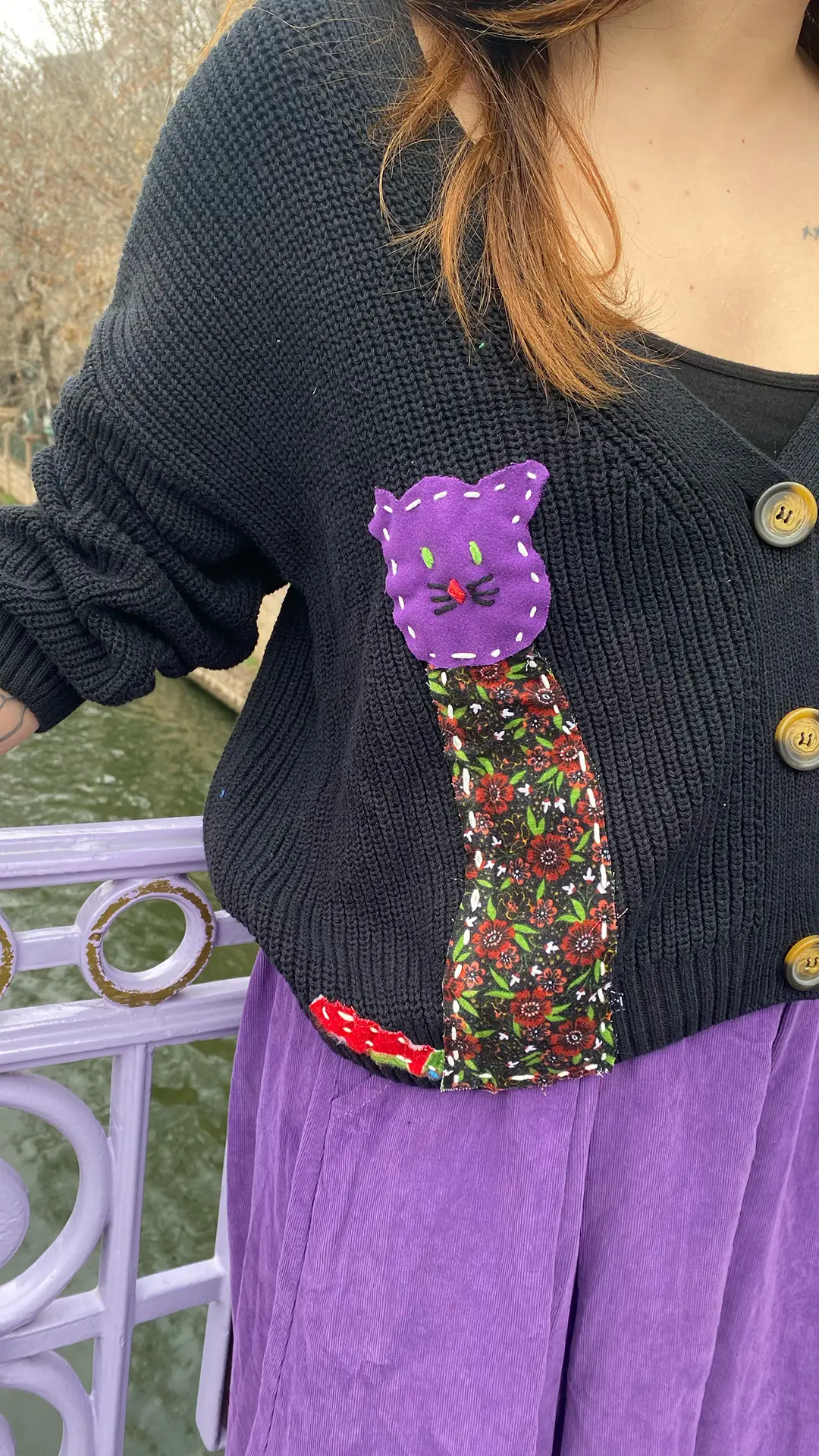 Özel Tasarım, V Yaka, Kedi İşlemeli Hırka.