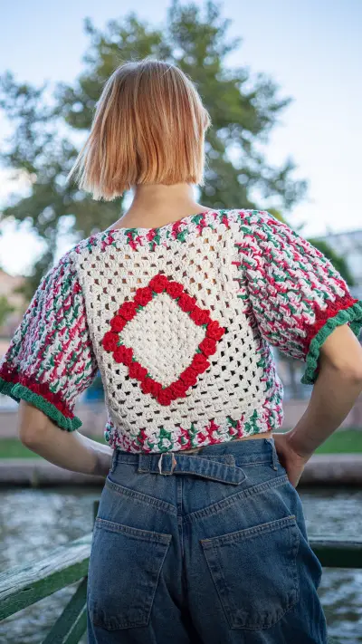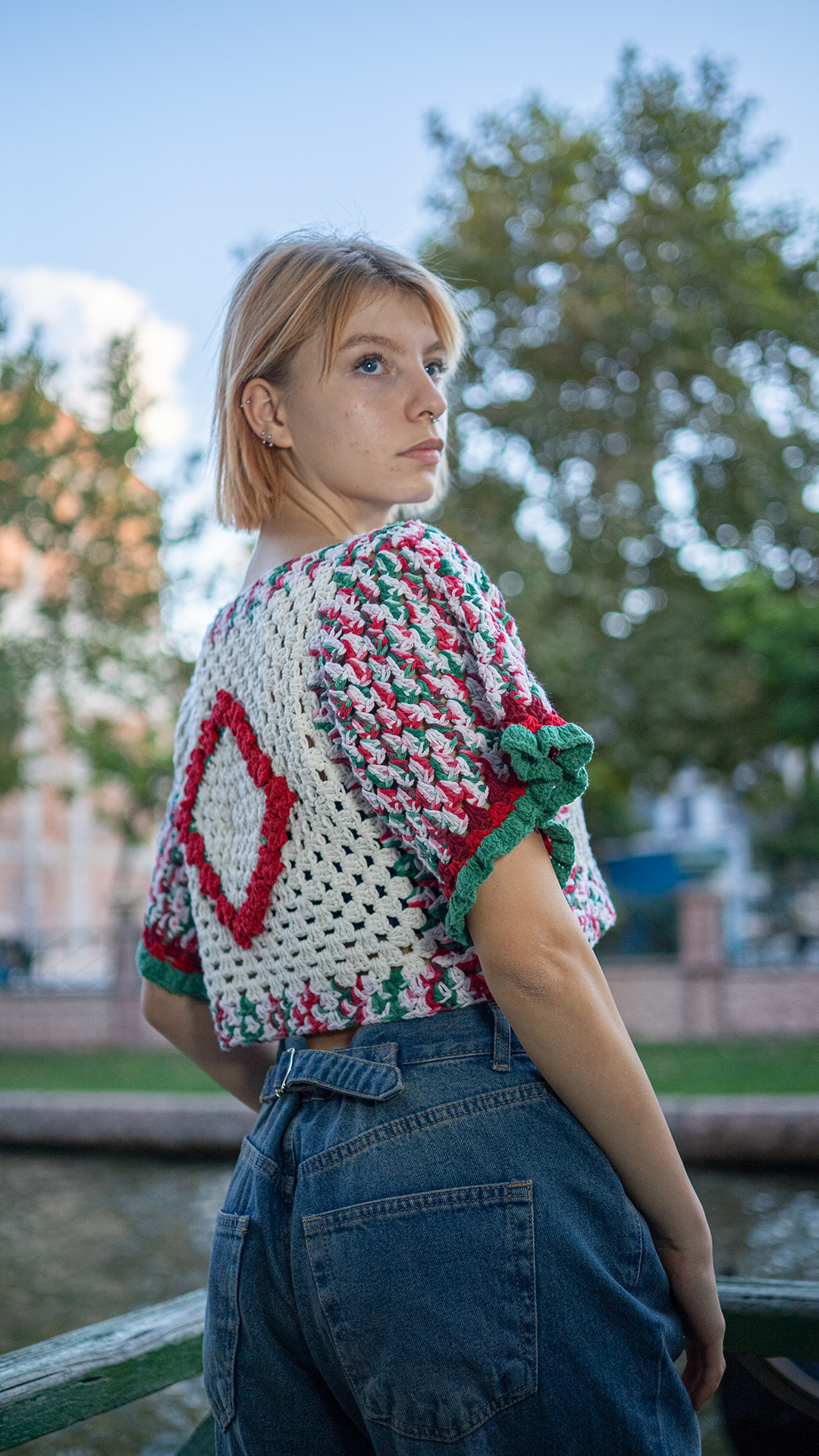 Özel Tasarım, Kolları Fırfır Detaylı, Önü Çiçek İşlemeli Crop